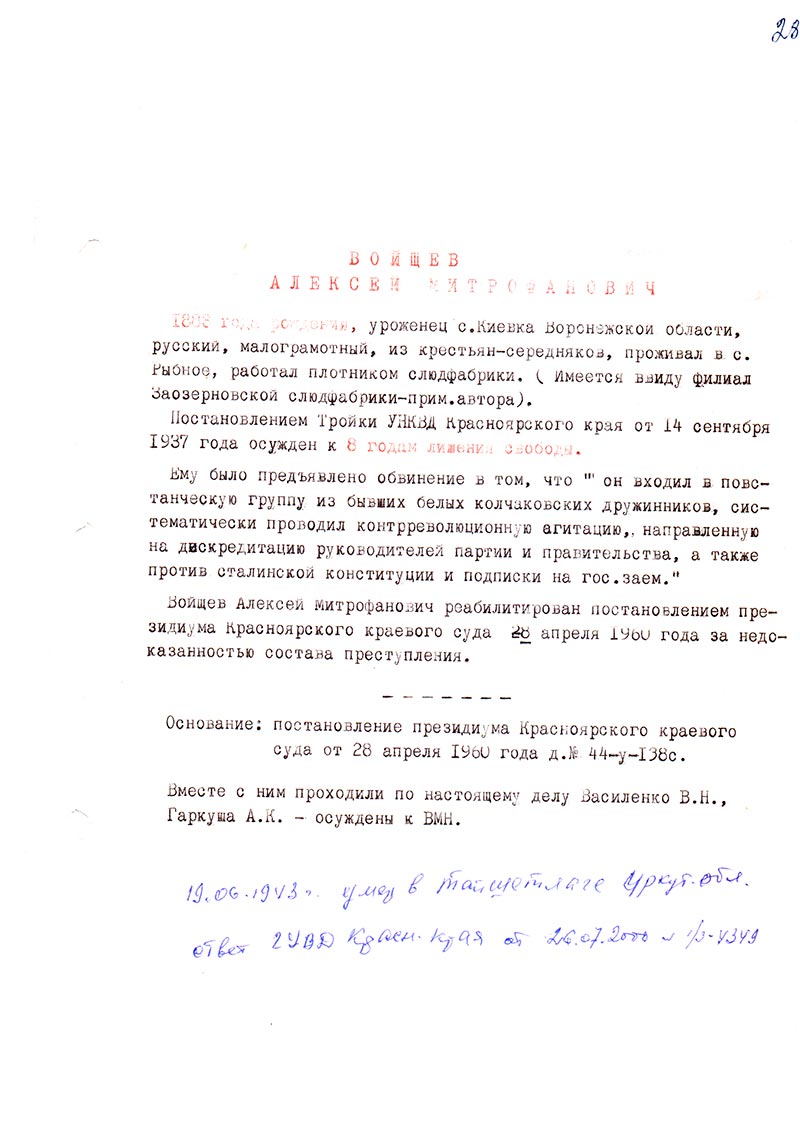 Войщев Алексей Митрофанович реабилитирован постановлением президиума Красноярского краевого суда 28 апреля 1960 года за недоказанностью состава преступления.