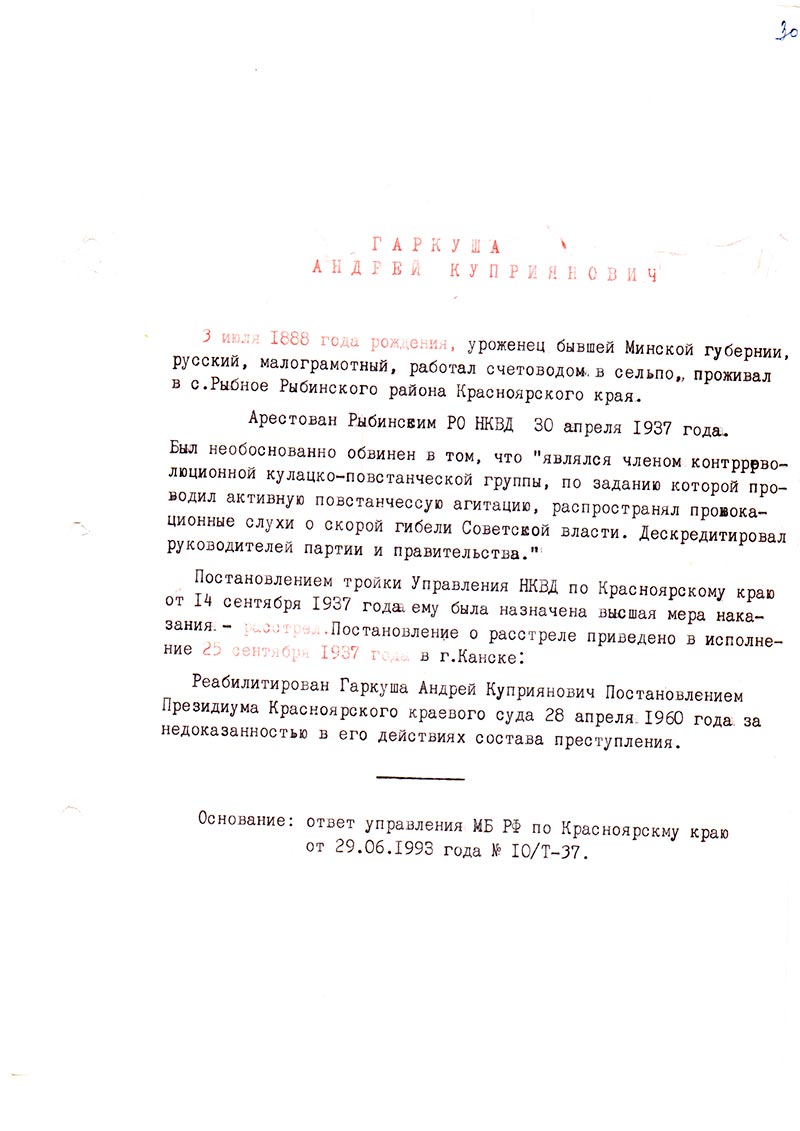 Реабилитирован Гаркуша Андрей Куприянович Постановлением Президиума Красноярского краевого суда 28 апреля. 1960 года. за недоказанностью в его действиях состава преступления.