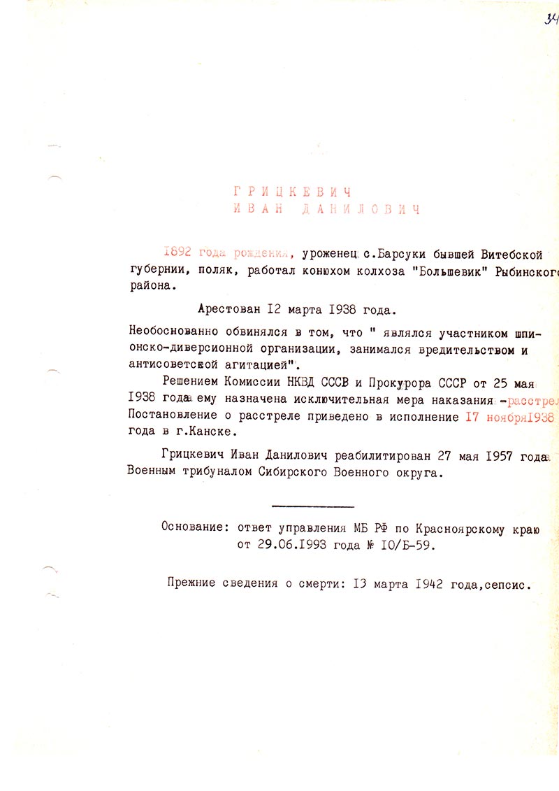 Грицкевич Иван Данилович реабилитирован 27 мая 1957 года Военным трибуналом Сибирского Военного округа.