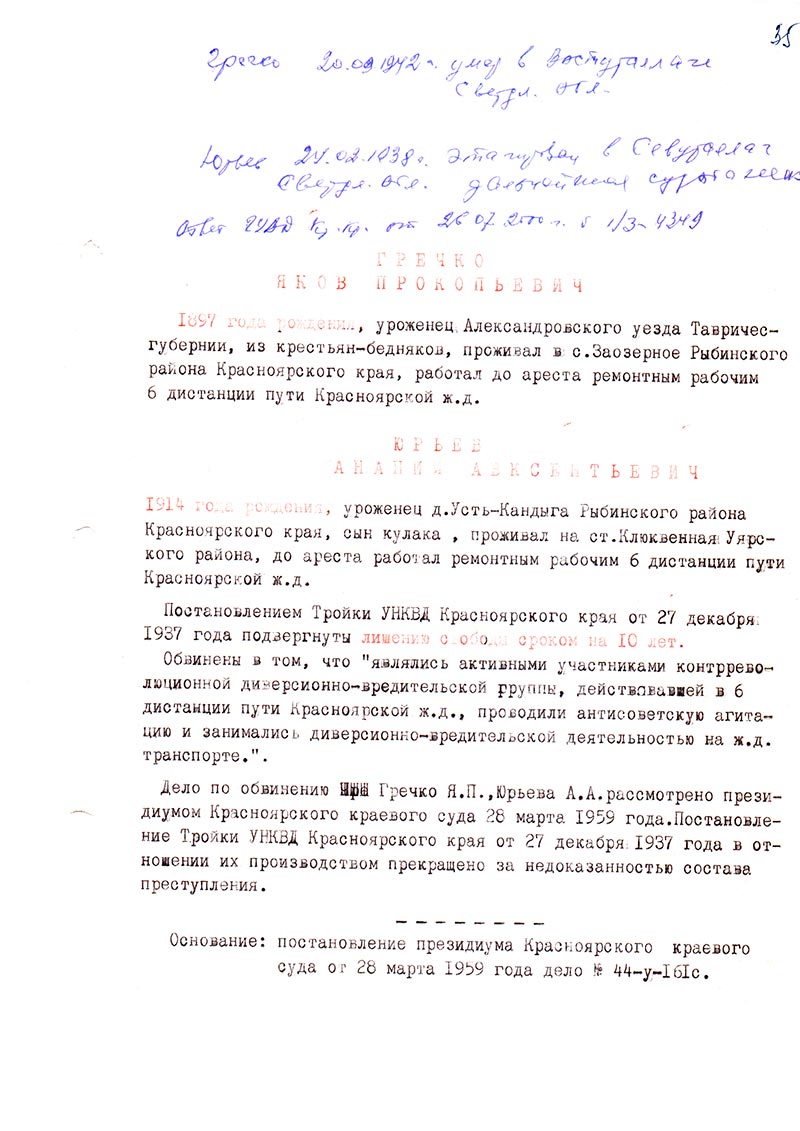 Гречко 20.09.1942 г. умер в Востураллаге Свердл. обл.