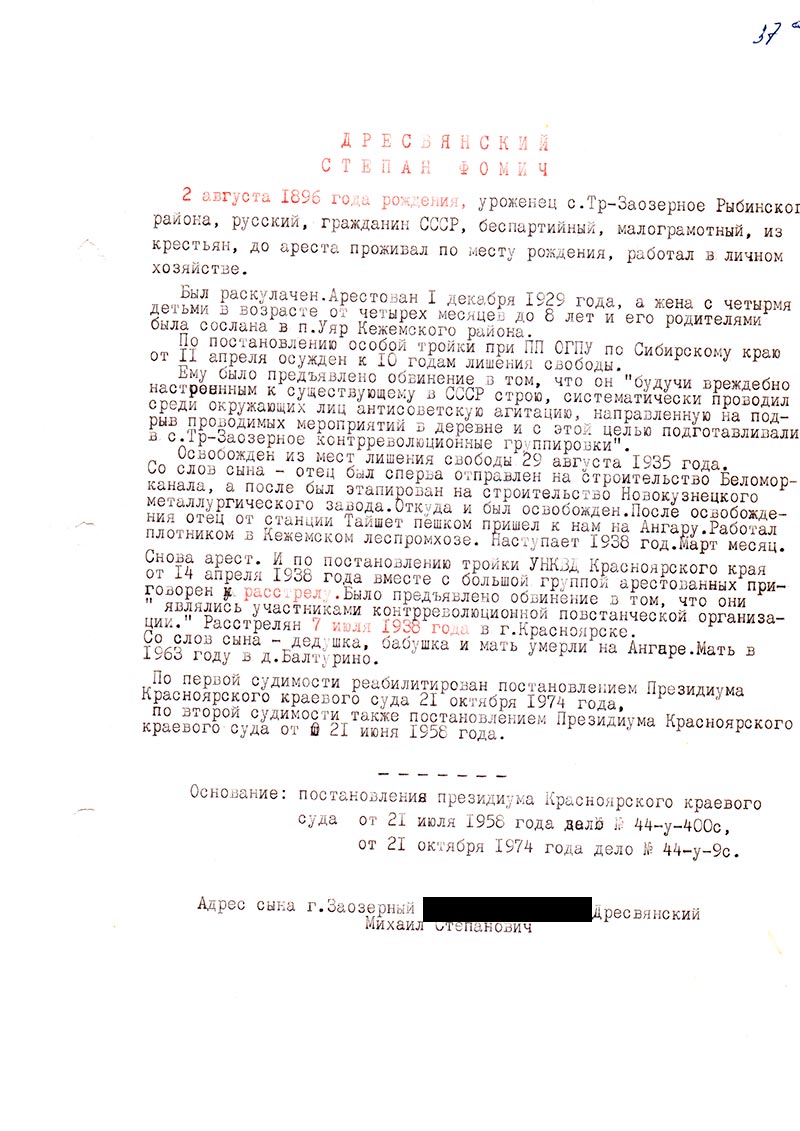 По первой судимости реабилитирован постановлением Президиума Красноярского краевого суда 21 октября 1974 года, по второй судимости также постановлением Президиума Красноярского краевого суда от 21 июня 1958 года.