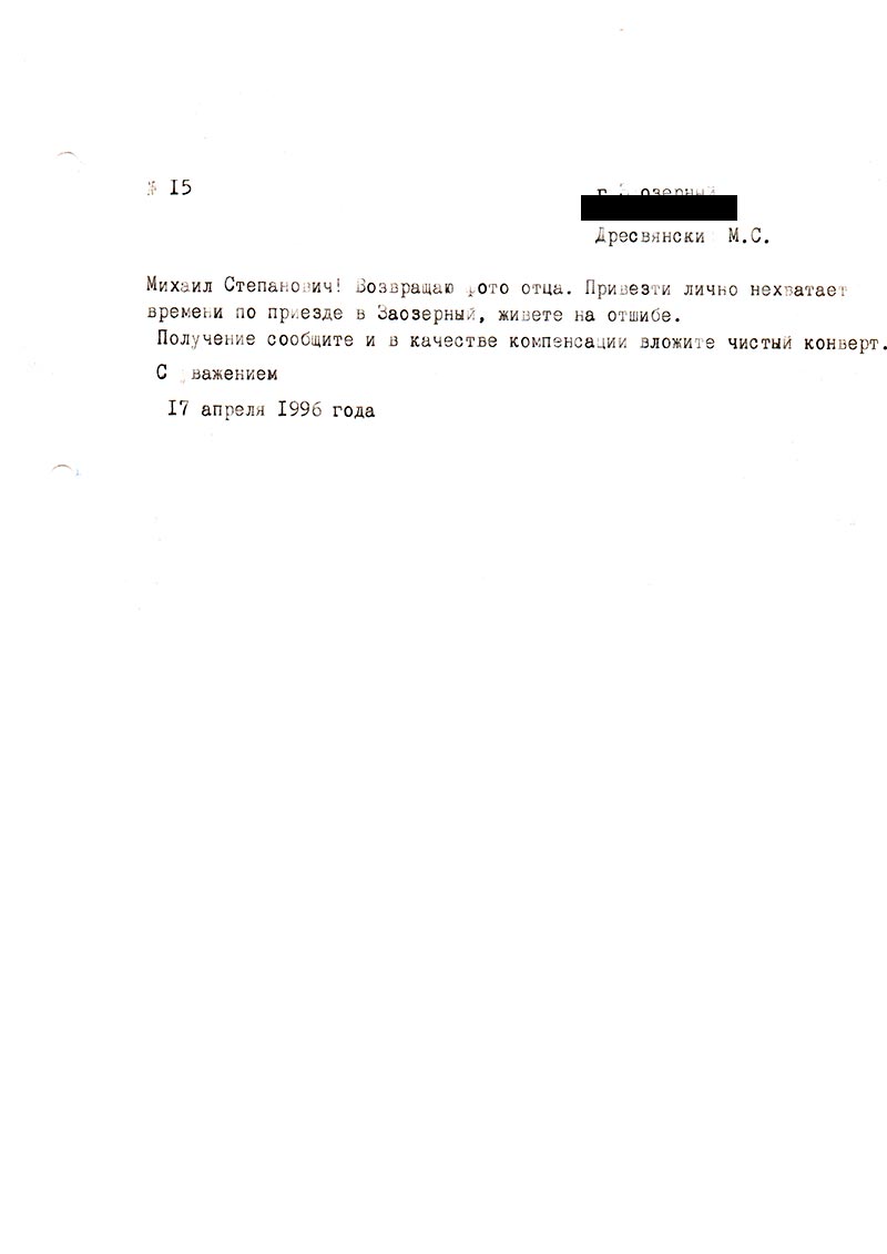 Адрес сына г. Заозерный Дресвянский Михаил Степанович.
