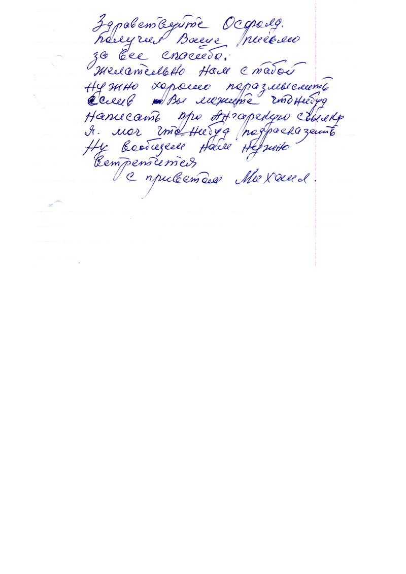 Здравствуйте Освальд. Получил Ваше письмо. За все спасибо. Желательно нам с тобой нужно хорошо поразмыслить.