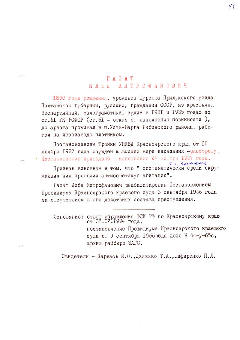 Галат Илья Митрофанович реабилитирован Постановлением Президиума Красноярского краевого суда 3 сентября 1966 года за отсутствием в его действиях состава преступления.