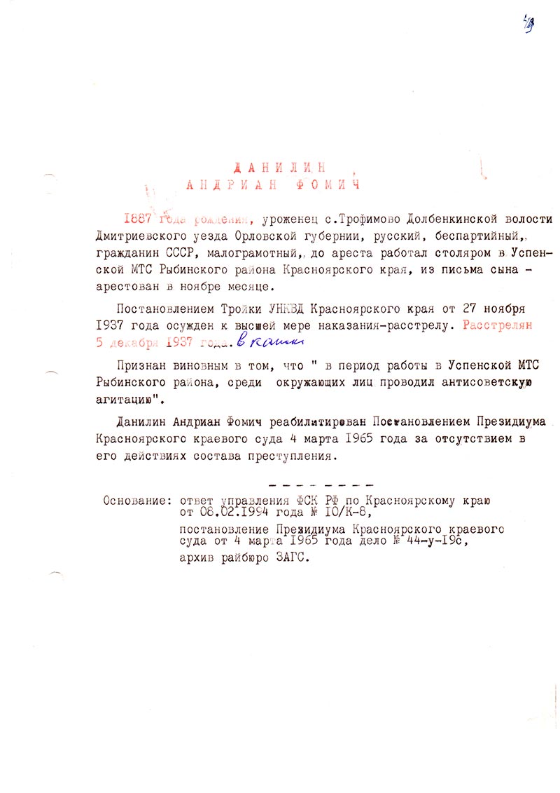 Дело по обвинению Данилина Андриана Фомича пересмотрено в 1965 г. 4 марта. Постановление Тройки УНКВД Красноярского края от 27 ноября 1937 года отменено и дело в отношении Данилина Андриана Фомича производством прекращено, реабилитирован. Председатель краевого суда Руднев. № 44-у-19с.