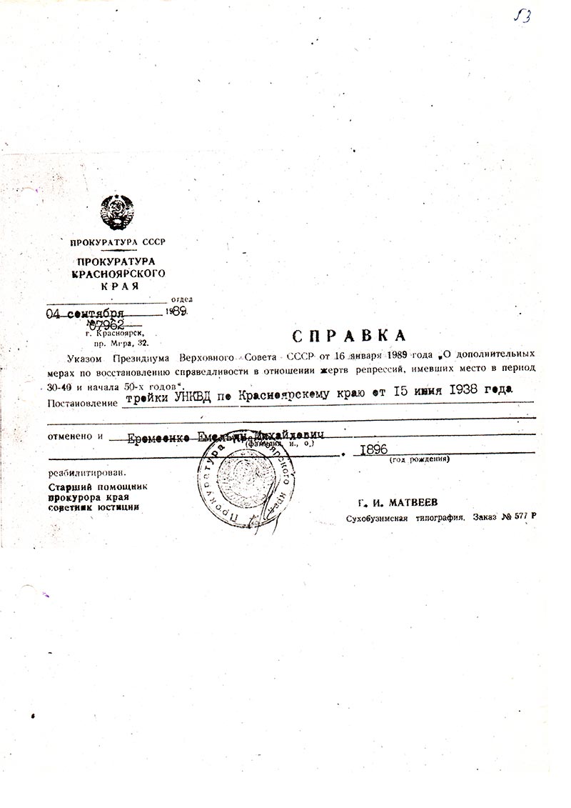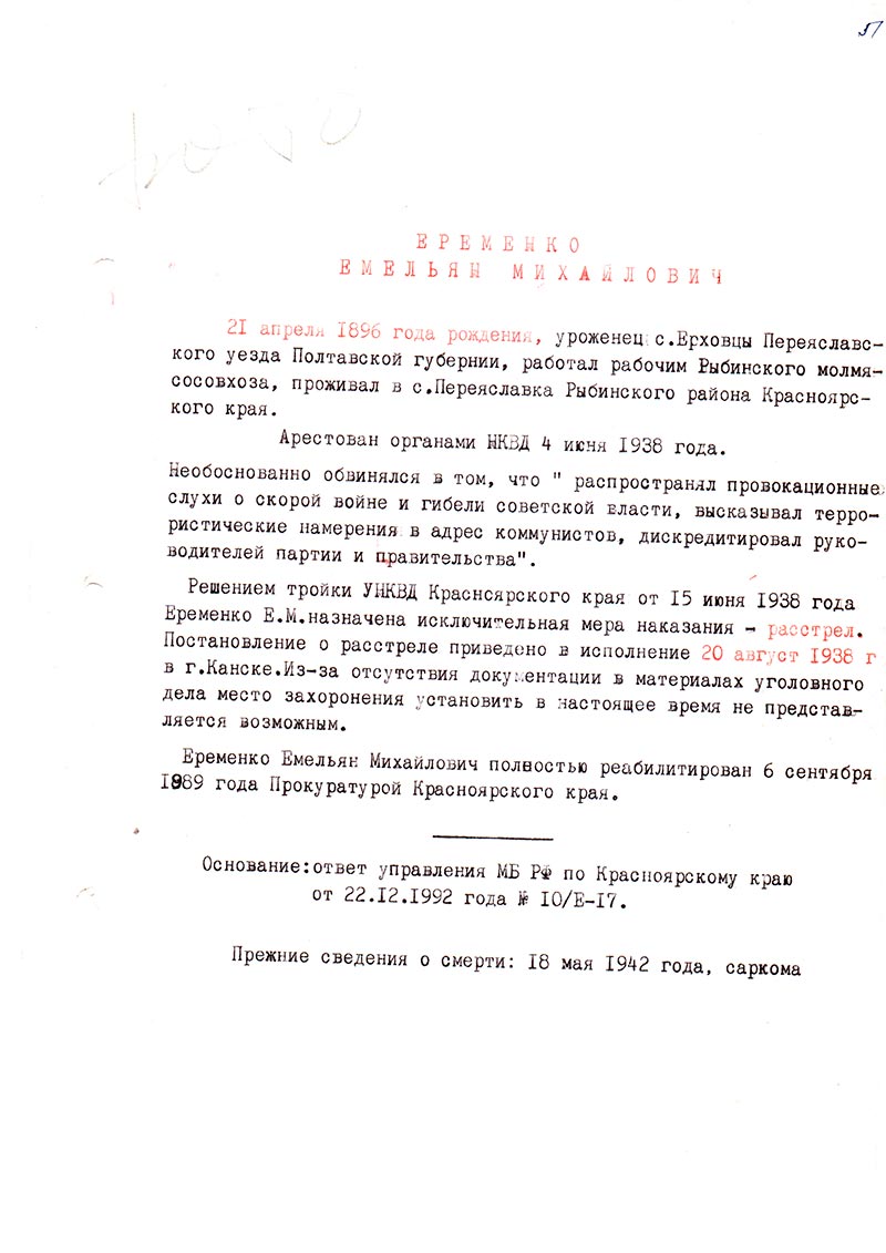 Решением тройки УНКВД Красноярского края от 15 июня 1938 года Еременко Е.М.