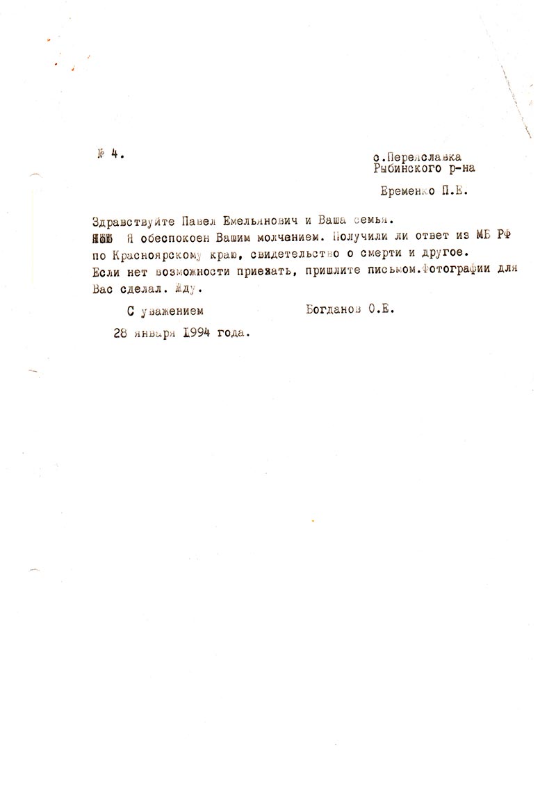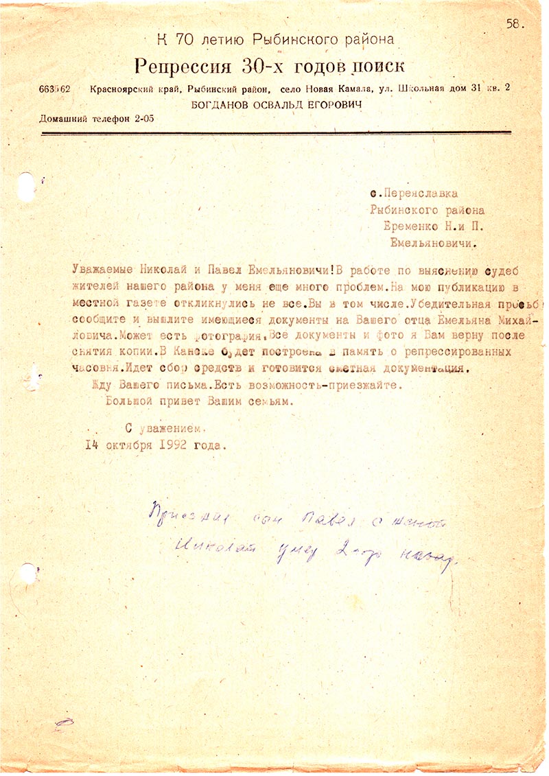 Уважаемые Николай и Павел Емельяновичи! В работе по выяснению судеб жителей