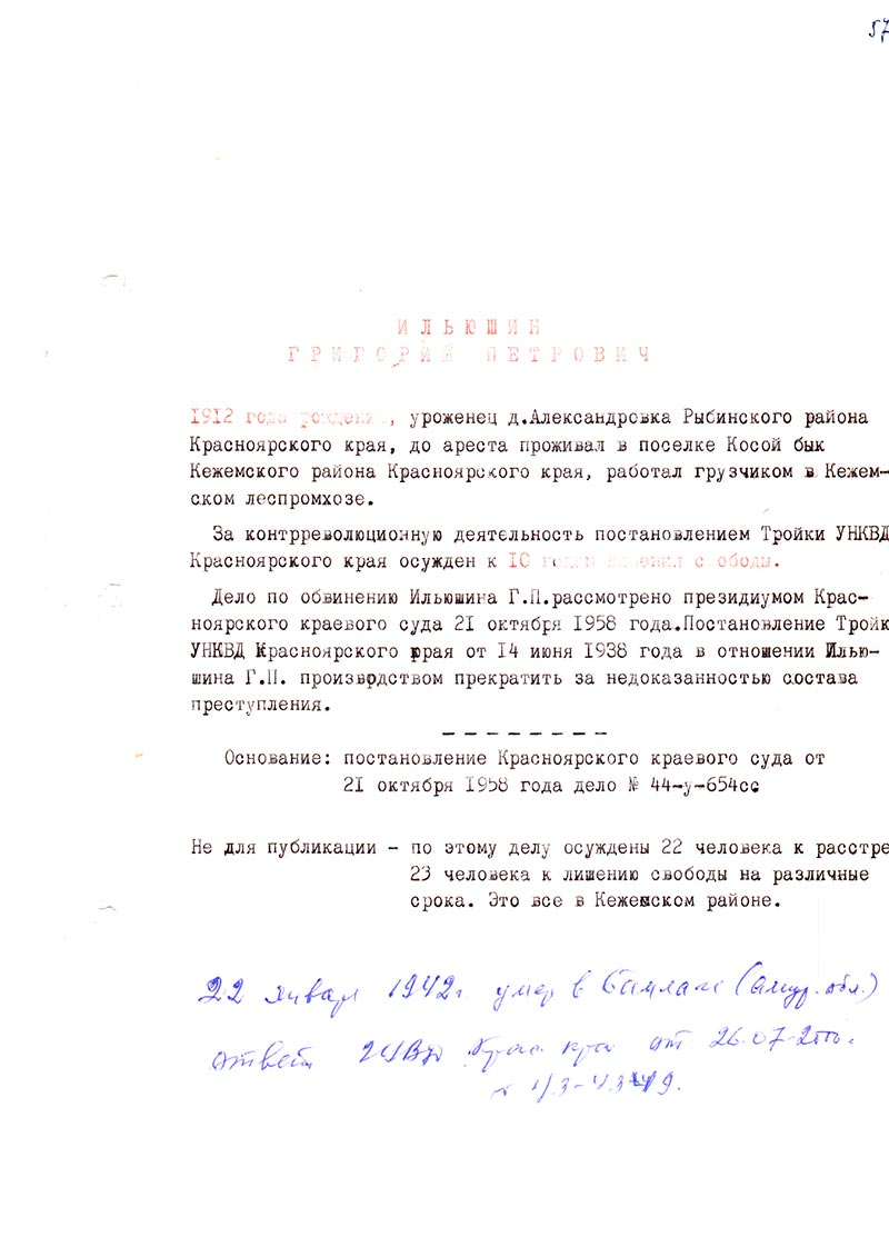 Дело по обвинению Ильюшина Г.П. рассмотрено президиумом Красноярского краевого суда 21 октября 1958 года. Постановление Тройки УНКВД Красноярского края от 14 июня 1938 года в отношении Ильюшина Г.П. производством прекратить за недоказанностью состава преступления.