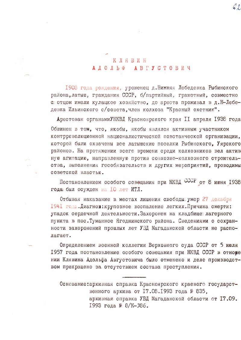 Определением военной коллегии Верховного суда СССР от 5 июля 1957 года постановление особого совещания при НКВД СССР в отношении Клявина Адольфа Августовича было отменено и дело производством прекращено за отсутствием состава преступления.