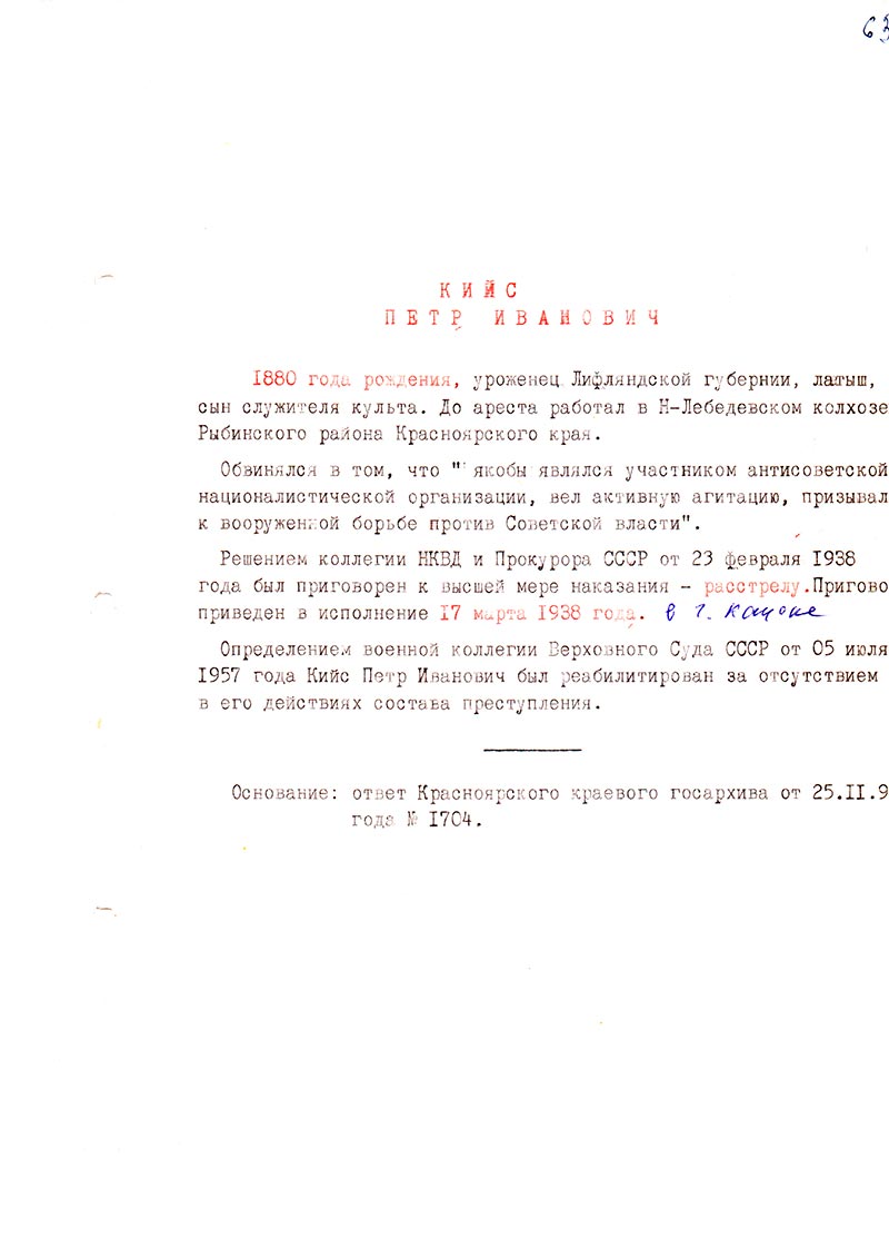 Определением военной коллегии Верховного Суда СССР от 05 июля 1957 года Кийс Петр Иванович был реабилитирован за отсутствием в его действиях состава преступления.