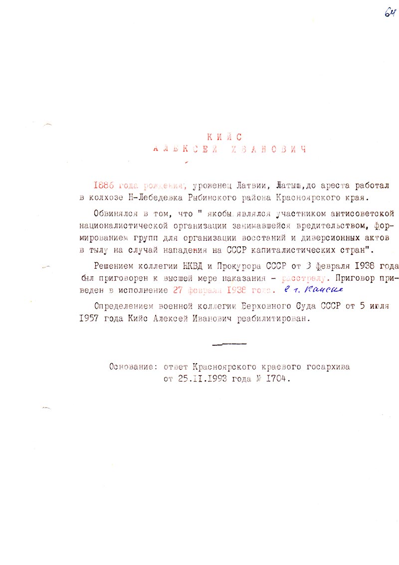 Определением военной коллегии Верховного Суда СССР от 5 июля 1957 года Кийс Алексей Иванович реабилитирован.