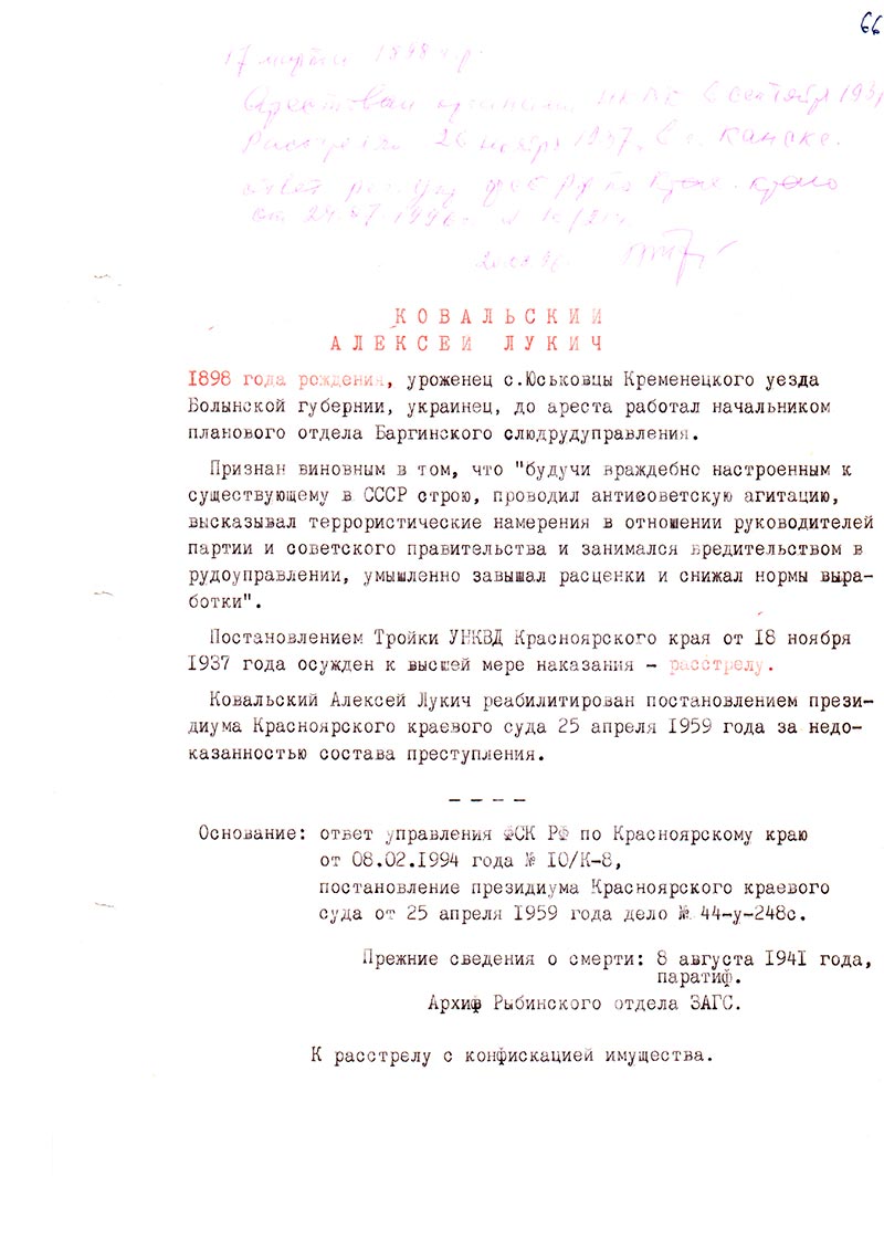 Ковальский Алексей Лукич реабилитирован постановлением президиума Красноярского краевого суда 25 апреля 1959 года за недоказанностью состава преступления.