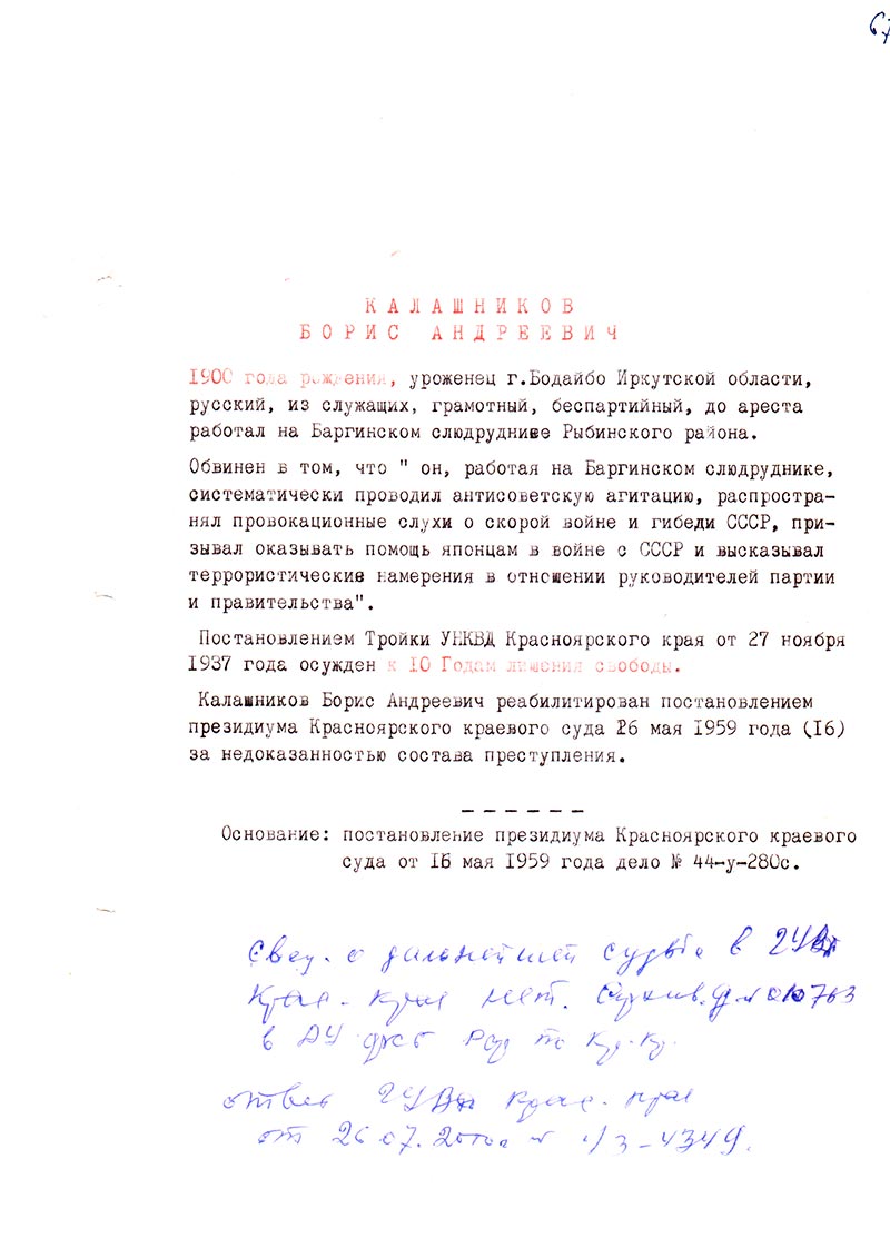 Калашников Борис Андреевич реабилитирован постановлением президиума Красноярского краевого суда 26 мая 1959 года (16) за недоказанностью состава преступления.