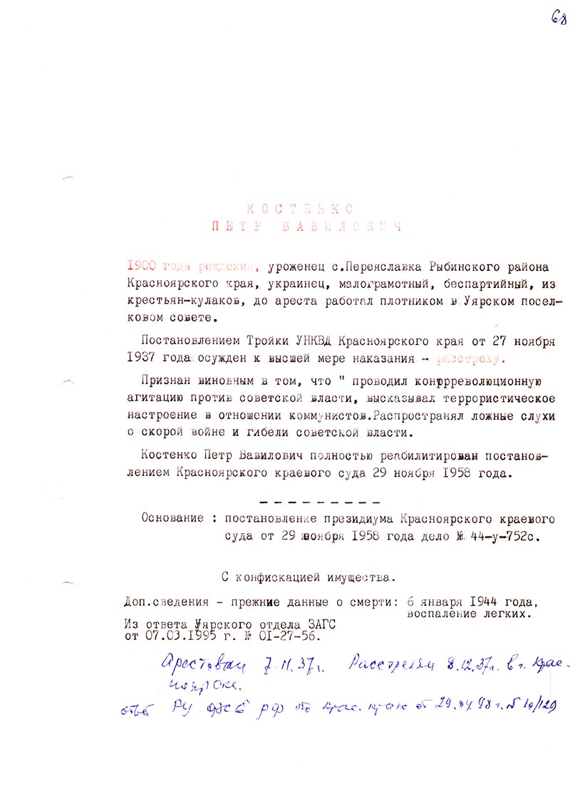 Костенко Петр Вавилович полностью реабилитирован постановлением Красноярского краевого суда 29 ноября 1958 года.