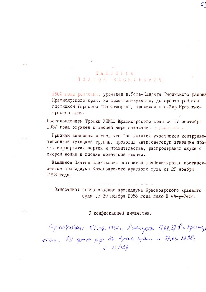 Кашлинов Платон Васильевич полностью реабилитирован постановлением президиума Красноярского краевого суда от 29 ноября 1958 года.