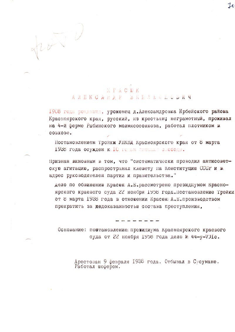Дело по обвинению Красюк А.Е. рассмотрено президиумом Красноярского краевого суда 22 ноября 1958 года. Постановление Тройки от 8 марта 1938 года в отношении Красюк А.Е. производством прекратить за недоказанностью состава преступления.