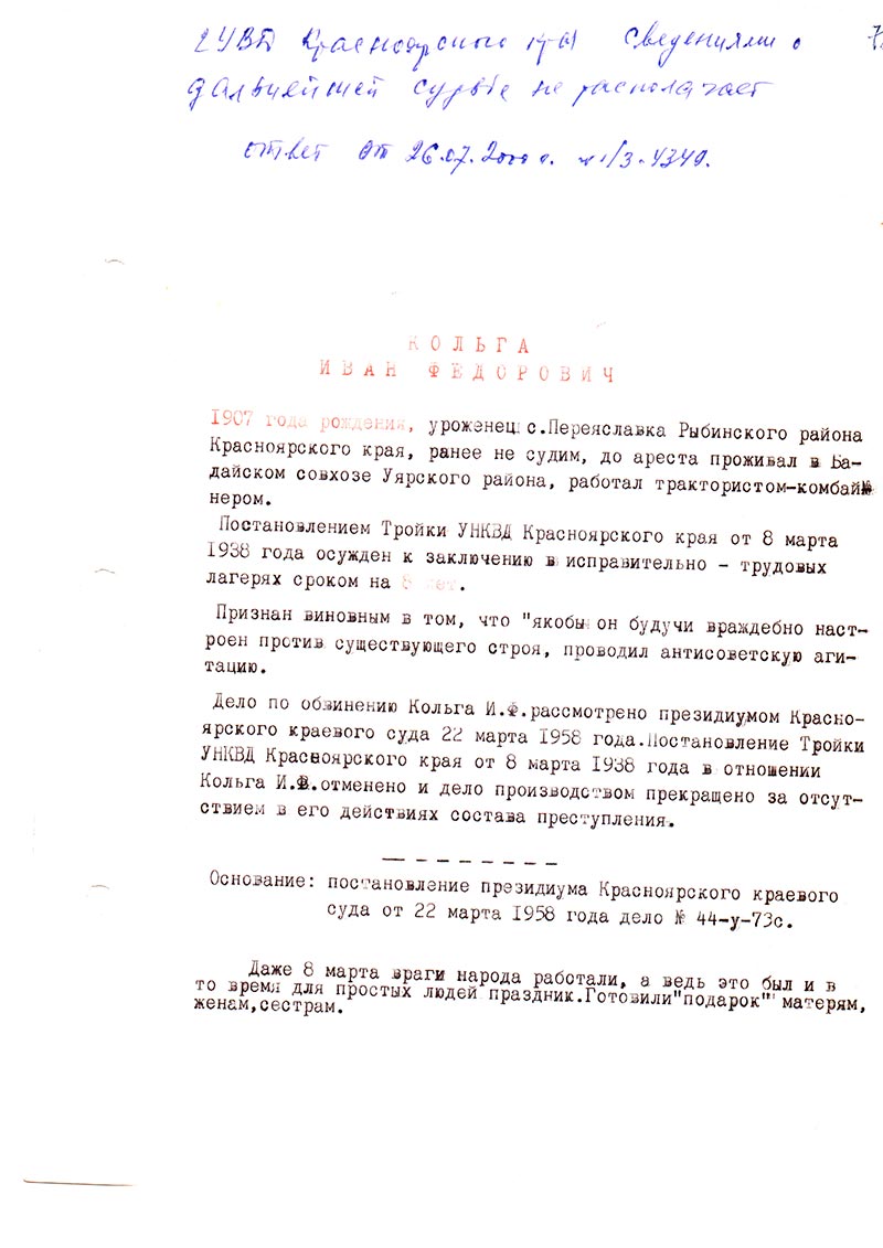 Дело по обвинению Кольга И.Ф. рассмотрено президиумом Красноярского краевого суда 22 марта 1958 года. Постановление Тройки УНКВД Красноярского края от 8 марта 1938 года в отношении Кольга И.Ф. отменено и дело производством прекращено за отсутствием в его действиях состава преступления.
