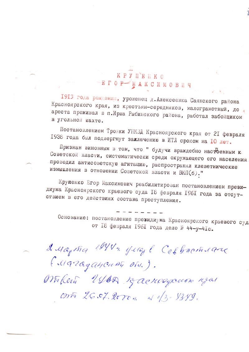 Крупенко Егор Максимович реабилитирован постановлением президиума Красноярского