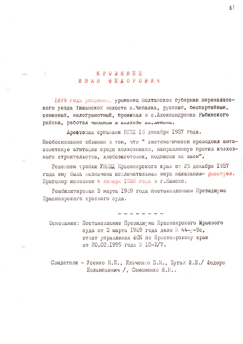 Основание: Постановление Президиума Красноярского краевого суда от 3 марта 1969 года дело № 44-у-9с, ответ управления ФСК по Красноярскому краю от 20.02.1995 года № 10-Б/7.