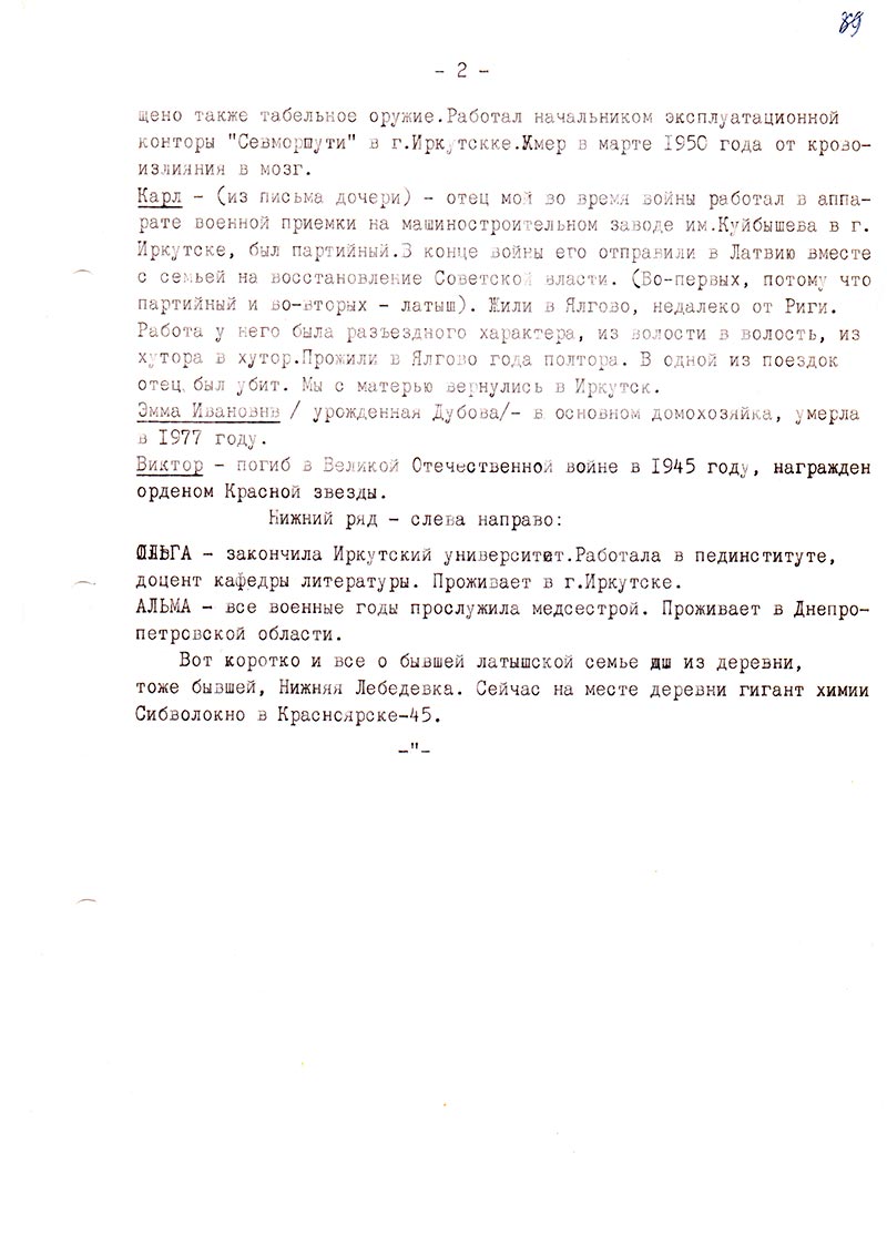Карл — (из письма дочери) — отец мой во время войны работал в аппарате военной приемки на машиностроительном заводе им. Куйбышева в г. Иркутске, был партийный. В конце войны его отправили в Латвию вместе с семьей на восстановление Советской власти. (Во-первых, потому что партийный и во-вторых — латыш). Жили в Ялгово, недалеко от Риги.
