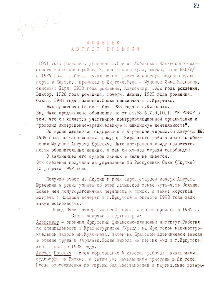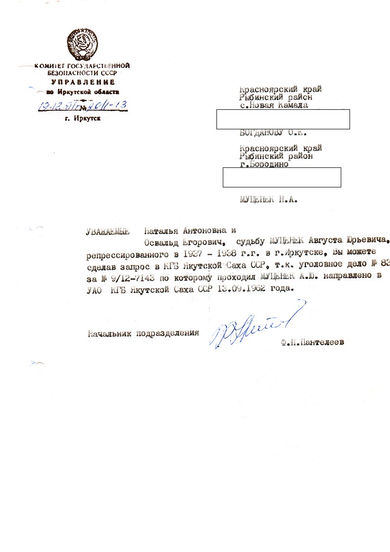 Уважаемая Наталья Антоновна и Освальд Егорович, судьбу Муценек Августа Юрьевича, репрессированного в 1937—1938 г.г. в г. Иркутске, Вы можете сделав запрос в КГБ Якутской Саха ССР. т.к. уголовное дело № 83 за № 9/12-7143 по которому проходил Муценек А.Ю. направлено в УАО КГБ Якутской Саха ССР 13.09.1962 года.