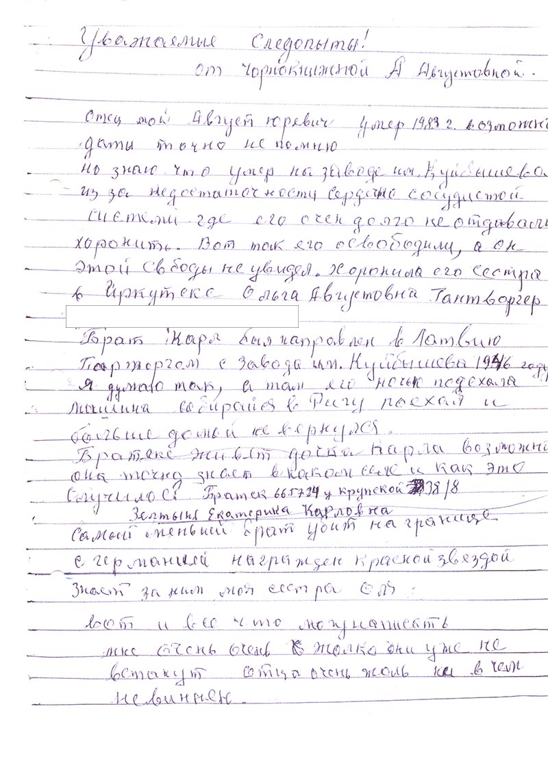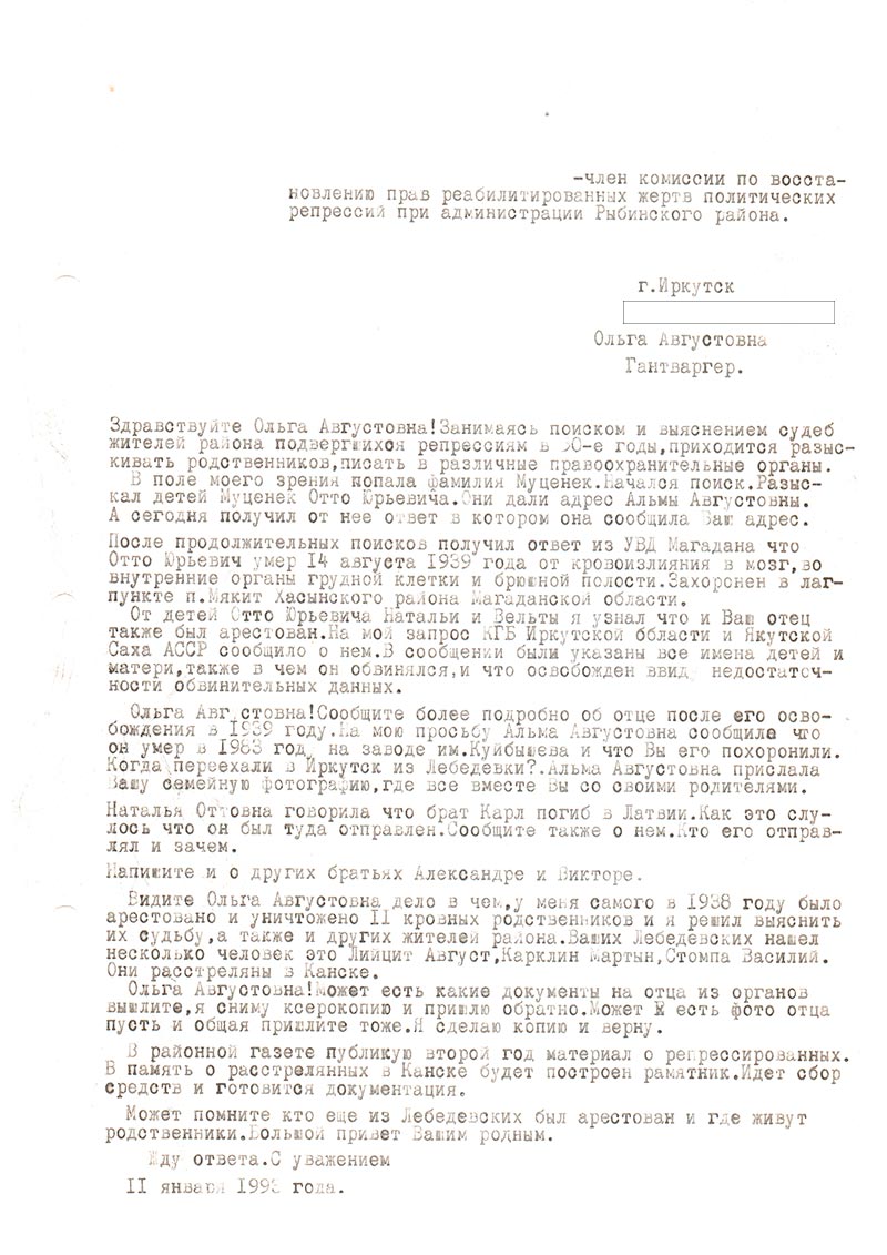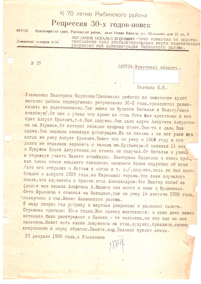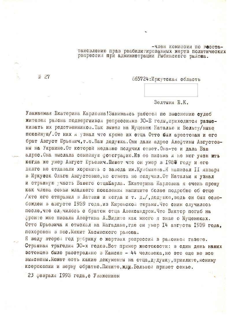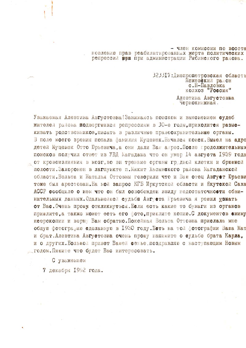 Я даже не знаю, чем смогу Вам помочь. Ведь я родилась в 1942 и поэтому мало что знаю и помню, если только со слов матери и бабушки. Бабушка (жена Августа Юрьевича Муценек) умерла давно. А мама умерла 8 лет назад, она бы могла написать и рассказать о тех тяжелых временах… Брат отца Александр Августович умер в январе 1992 г. До пенсии он работал на БрАЗе г. Братска, в ОТЗ НТО. Последнее время жили в Иркутске.
