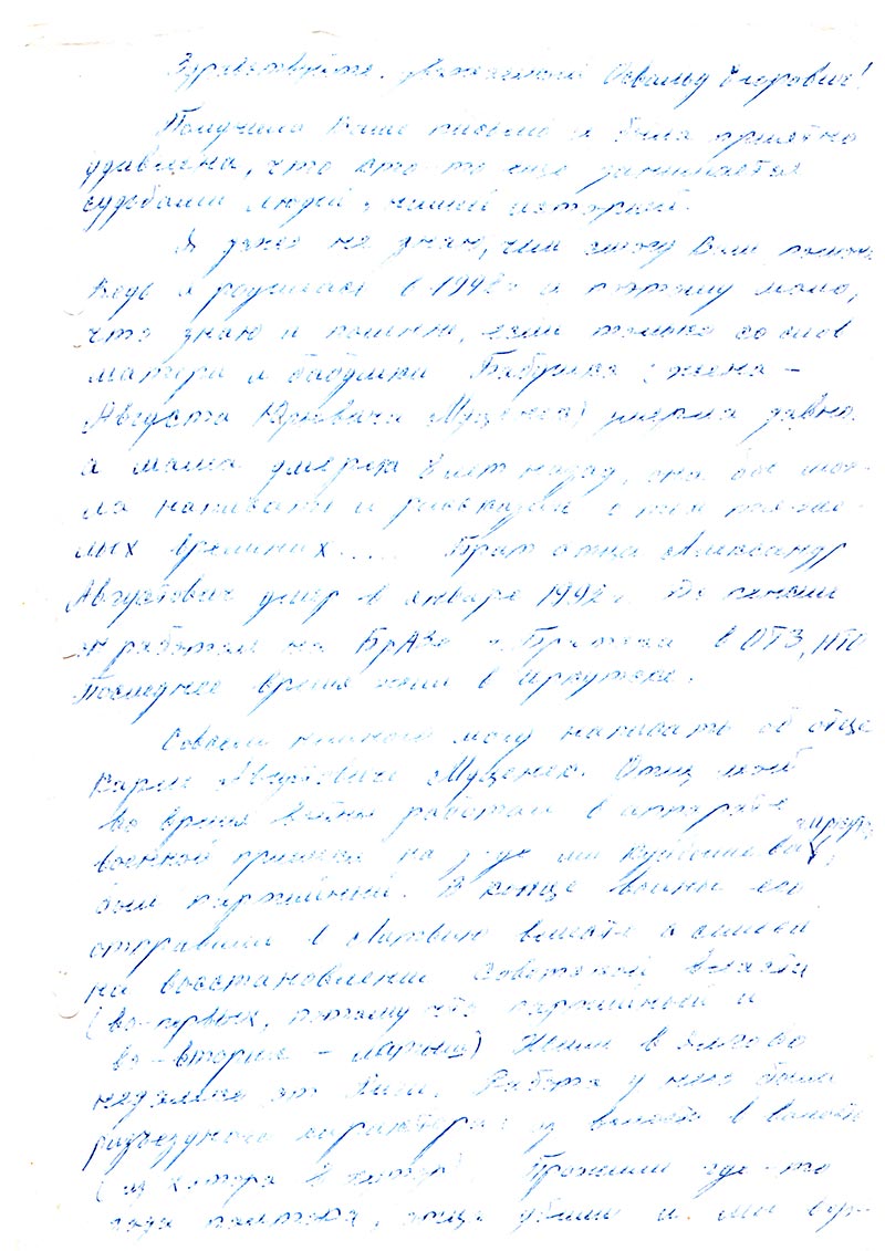 Здравствуйте уважаемый Освальд Егорович! Получила Ваше письмо и была приятно удивлена, что кто-то еще занимается судьбами людей, нашей историей.