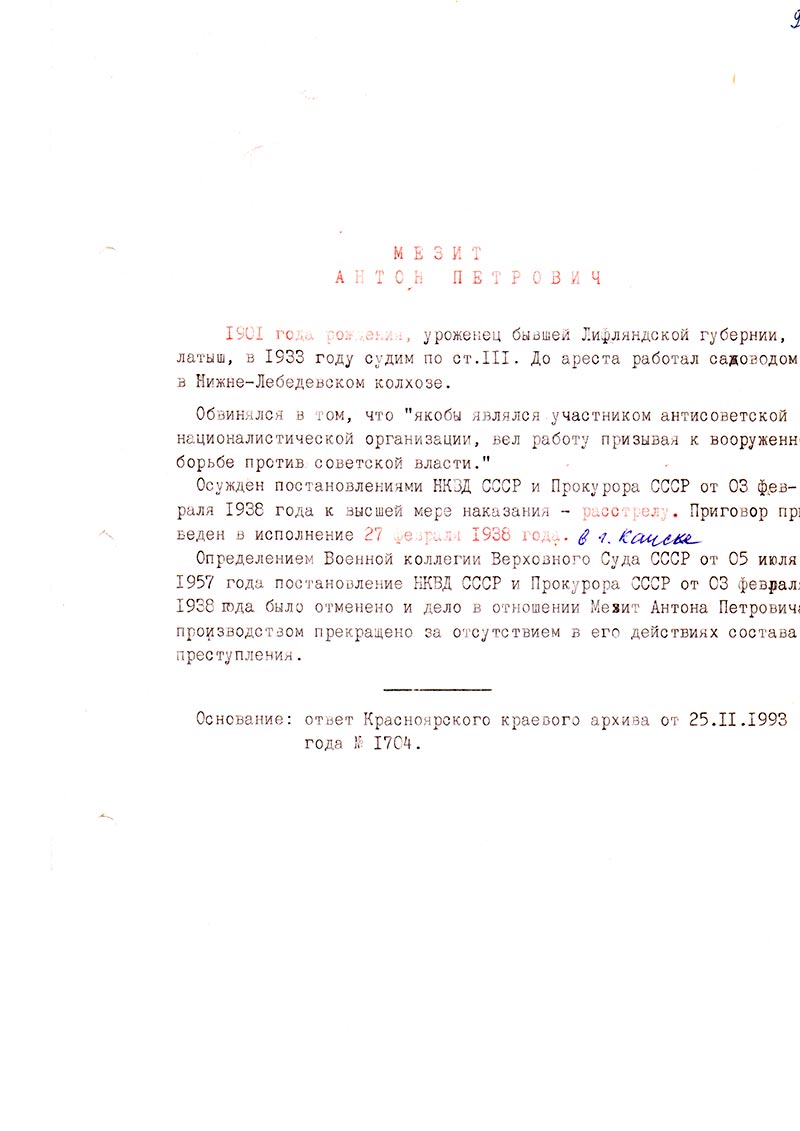 Определением Военной коллегии Верховного Суда СССР от 05 июля 1957 года постановление НКВД СССР и Прокурора СССР от 03 февраля 1938 года было отменено и дело в отношении Мезит Антона Петровича производством прекращено за отсутствием в его действиях состава преступления.