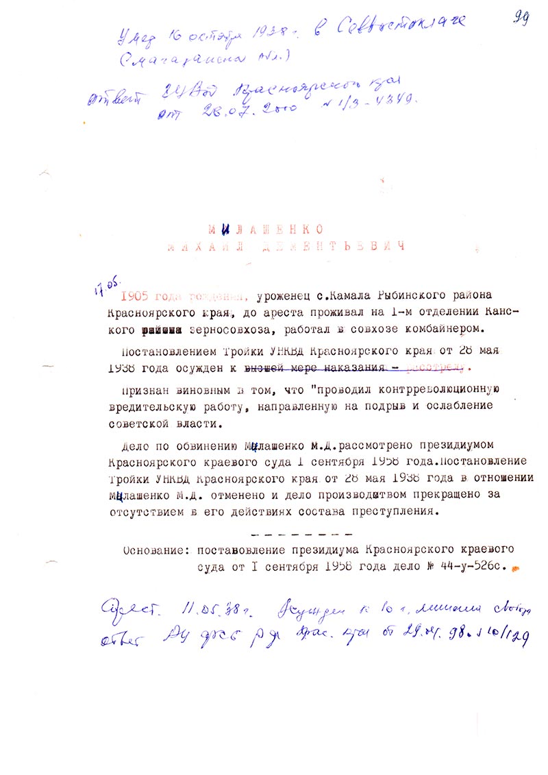 Дело по обвинению Милашенко М.Д. рассмотрено президиумом Красноярского краевого суда 1 сентября 1938 года. Постановление тройки УНКВД Красноярского края от 20 мая 1938 года в отношении Милашенко М.Д. отменено и дело производством прекращено за отсутствием в его действиях состава преступления.