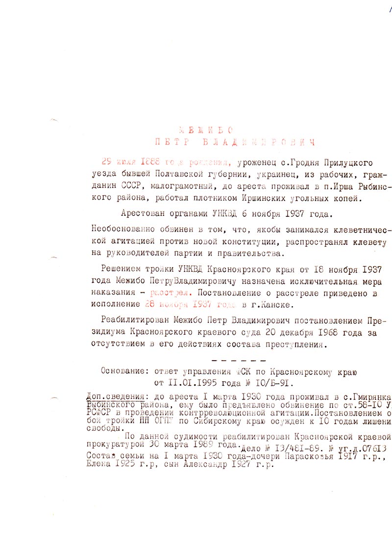 Решением тройки УНКВД Красноярского края от 18 ноября 1937 года Межибо Петру Владимировичу назначена исключительная мера наказания — расстрел. Постановление о расстреле приведено в исполнение 28 ноября 1937 года в г. Канске.