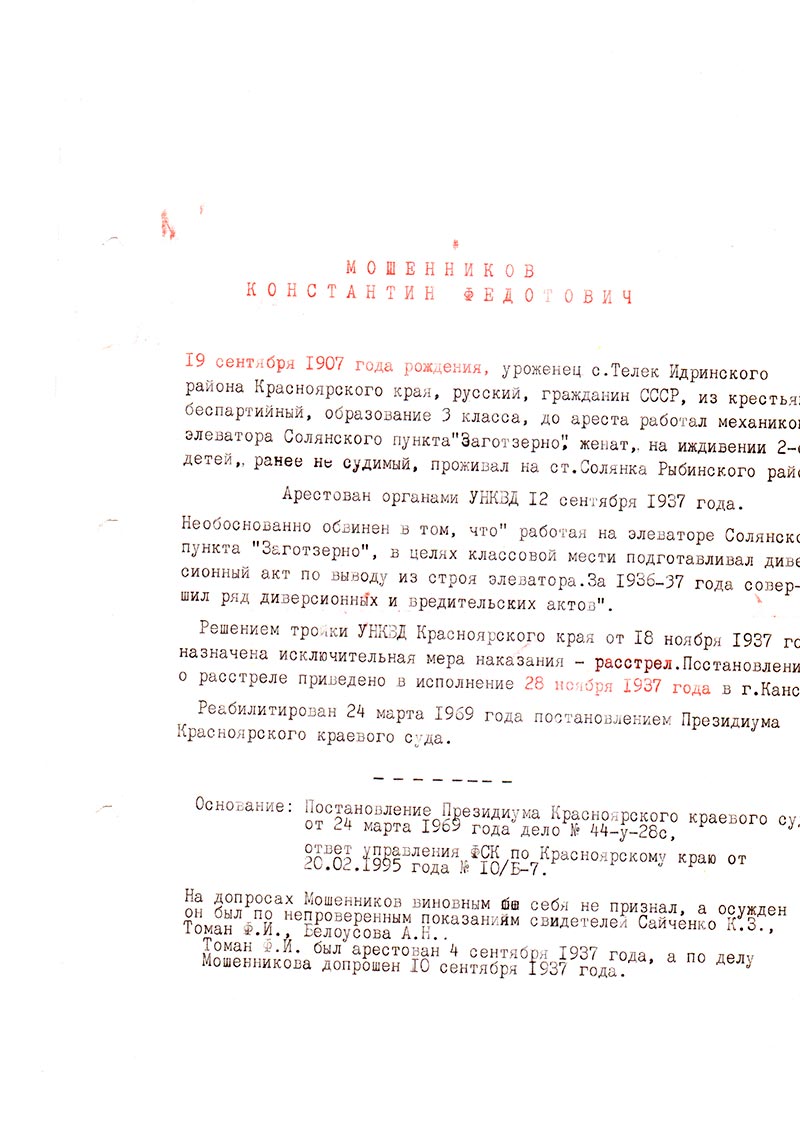 На допросах Мошенников виновным себя не признал, а осужден он был по не проверенным показаниям свидетелей Сайченко К.3., Томан Ф.И., Белоусова А.Н. Томан Ф.И. был арестован 4 сентября 1937 года, а по делу Мошенникова допрошен 10 сентября 1937 года.