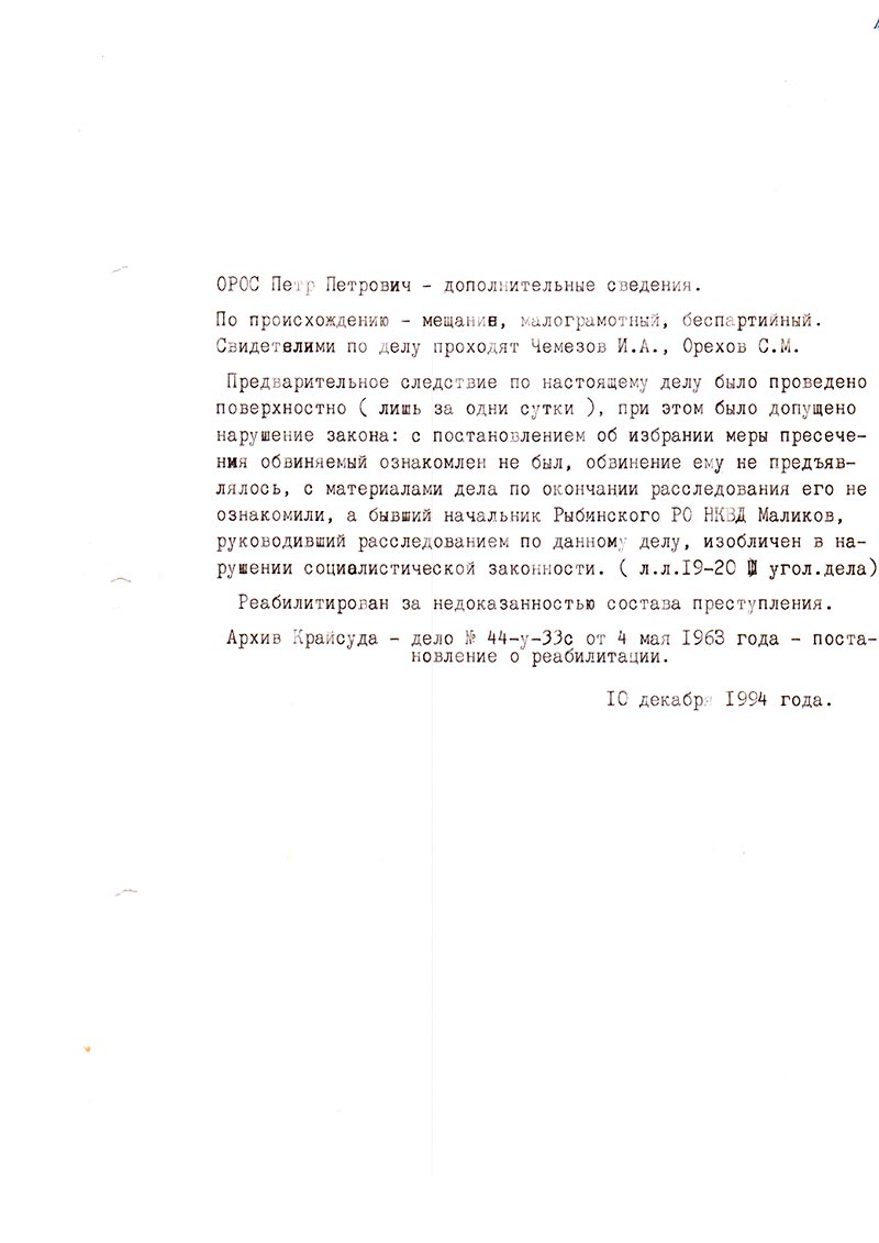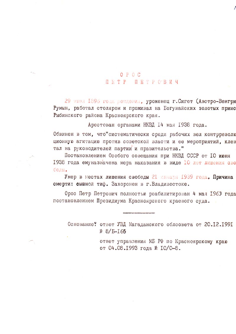 Орос Петр Петрович полностью реабилитирован 4 мая 1963 года постановлением Президиума Красноярского краевого суда.