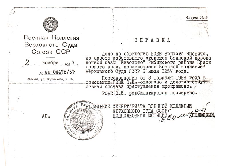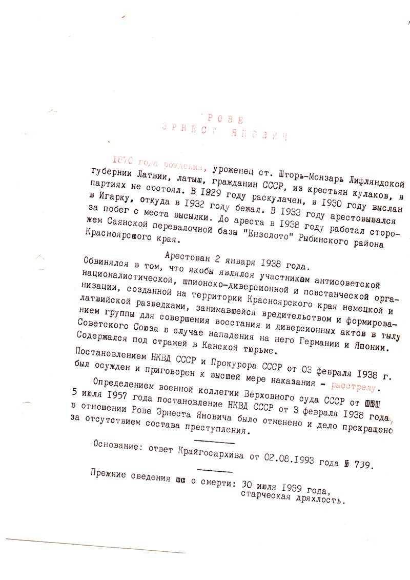Определением военной коллегии Верховного суда СССР от 5 июля 1957 года постановление НКВД СССР от 3 февраля 1938 года. в отношении Рове Эрнеста Яновича было отменено и дело прекращено за отсутствием состава преступления.