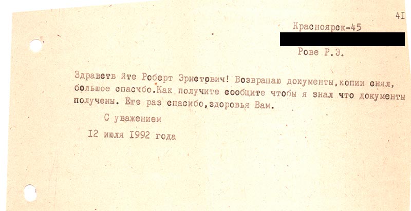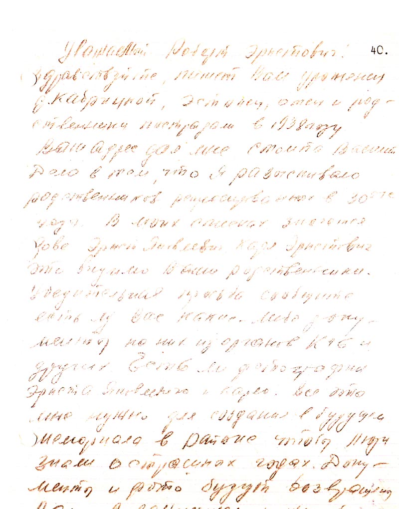 Уважаемый Роберт Эрнестович! Здравствуйте, пишет Вам уроженец д. Кабрицкой, эстонец отец и родственники пострадали в 1938 году. Ваш адрес дал мне Стомпа Василий. Дело в том, что я разыскиваю родственников репрессированных в 30-е годы. В моих списках значатся Рове Эрнст Янович, Карл Эрнстович. Это видимо Ваши родственники. Убедительная просьба сообщите если ли у Вас какие-либо документы на них из органов КГБ и других. Есть ли фотографии Эрнста Яновича и Карла. Все это мне нужно для создания в будущем Мемориала в районе чтобы люди знали о страшных годах. Документы и фото будут возвращены Вам В дальнейшем нужно будет. [Продолжение письма отсутствует]