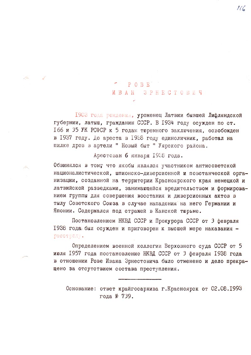 Определением военной коллегии Верховного суда СССР от 5 июля 1957 года постановление НКВД СССР от 3 февраля 1938 года в отношении Рове Ивана Эрнестовича было отменено и дело прекращено за отсутствием состава преступления.