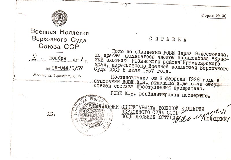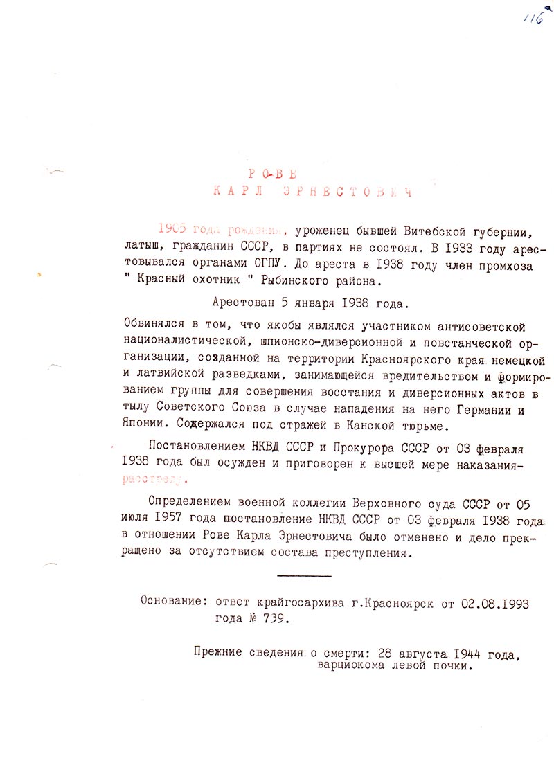 Определением военной коллегии Верховного суда СССР от 05 июля 1957 года постановление НКВД СССР от 03 февраля 1938 года в отношении Рове Карла Эрнестовича было отменено и дело прекращено за отсутствием состава преступления.