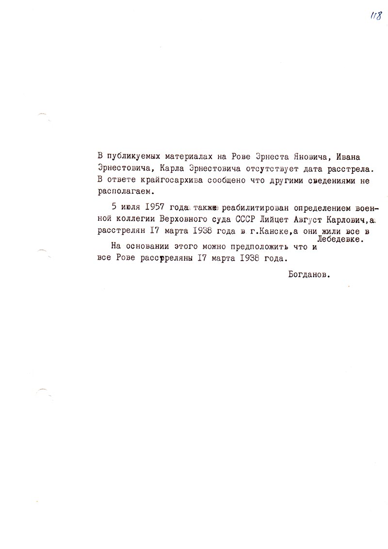 5 июля 1957 года также реабилитирован определением военной коллегии Верховного суда СССР Лийцет Август Карлович, а расстрелян 17 марта 1938 года в г. Канске, а они жили все в Лебедевке.