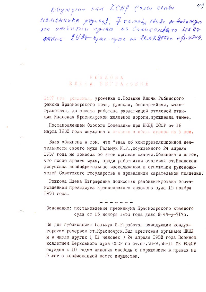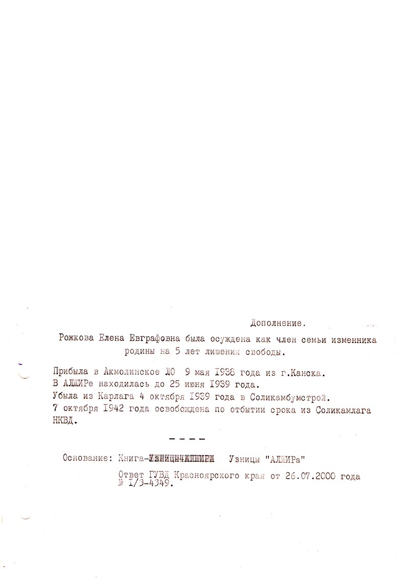 Рожкова Елена Евграфовна полностью реабилитирована постановлением президиума Красноярского краевого суда 15 ноября 1958 года.