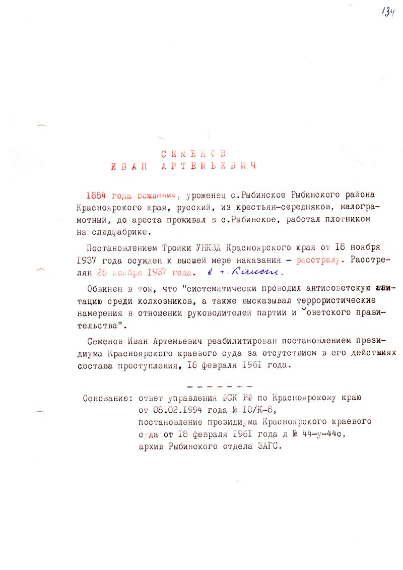 Семенов Иван Артемьевич реабилитирован постановлением президиума Красноярского