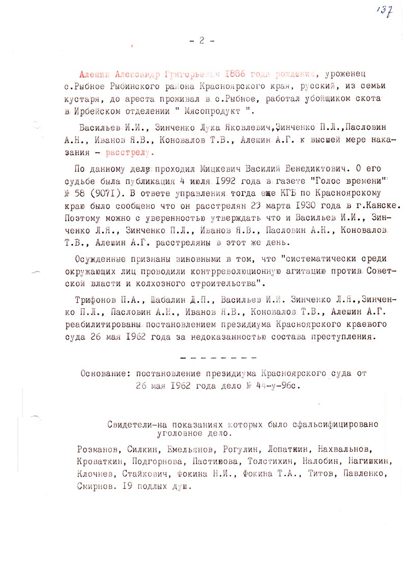Трифонов П.А., Шабалин Д.П., Васильев И.И. Зинченко Л.Я., Зинченко П.Л., Пасловин А.Н., Иванов Я.В., Коновалов Т.В., Алешин А.Г. реабилитированы постановлением президиума Красноярского краевого суда 26 мая 1962 года за недоказанностью состава преступления.