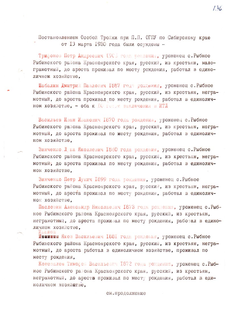 Постановлением Особой Тройки при П.П. ОГПУ по Сибирскому краю от 13 марта 1930 года были осуждены —