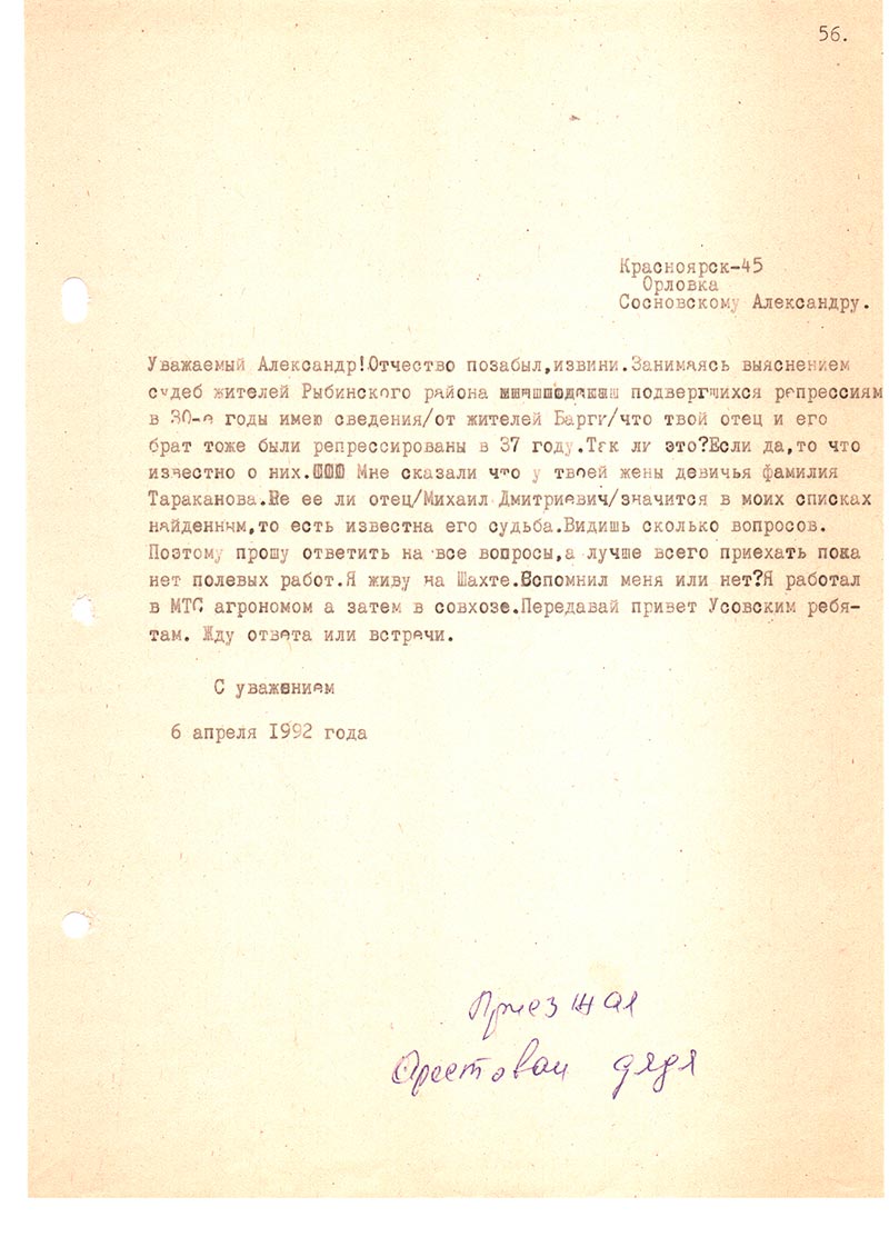 Уважаемый Александр! Отчество позабыл, извини. Занимаясь выяснением судеб жителей Рыбинского района подвергшихся репрессиям в 30-е годы имею сведения (от жителей Барги) что твой отец и его брат тоже были репрессированы в 37 году. Так ли это? Если да, то что известно о них. Мне сказали что у твоей жены девичья фамилия Тараканова. Не ее ли отец (Михаил Дмитриевич) значится в моих списках найденным, то есть известна его судьба. Видишь сколько вопросов.