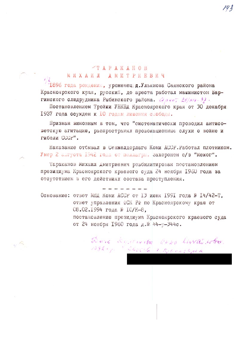 Тараканов Михаил Дмитриевич реабилитирован постановлением президиума Красноярского краевого суда 24 ноября 1960 года за отсутствием в его действиях состава преступления.