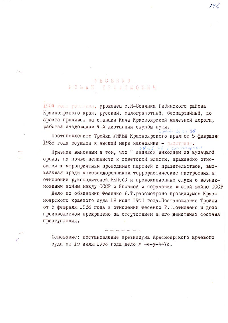 Дело по обвинению Фесенко Р.Т. рассмотрено президиумом Красноярского краевого суда 19 июля 1958 года. Постановление Тройки от 5 февраля 1938 года в отношении Фесенко Р.Т. отменено и дело производством прекращено за отсутствием в его действиях состава преступления.