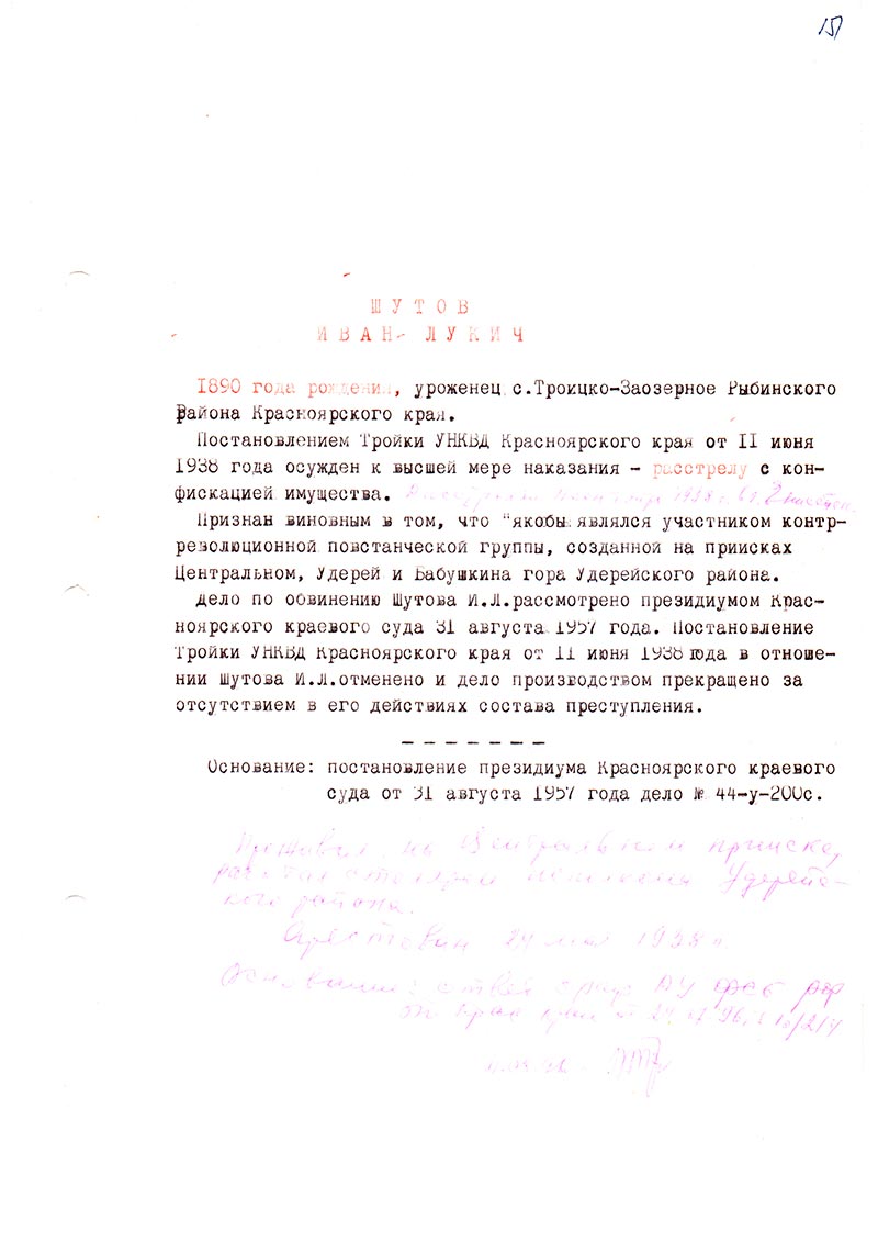Дело по обвинению Шутова И.Л. рассмотрено президиумом Красноярского краевого суда 31 августа 1957 года. Постановление Тройки УНКВД Красноярского края от 11 июня 1938 года в отношении Шутова И.Л. отменено и дело производством прекращено за отсутствием в его действиях состава преступления.