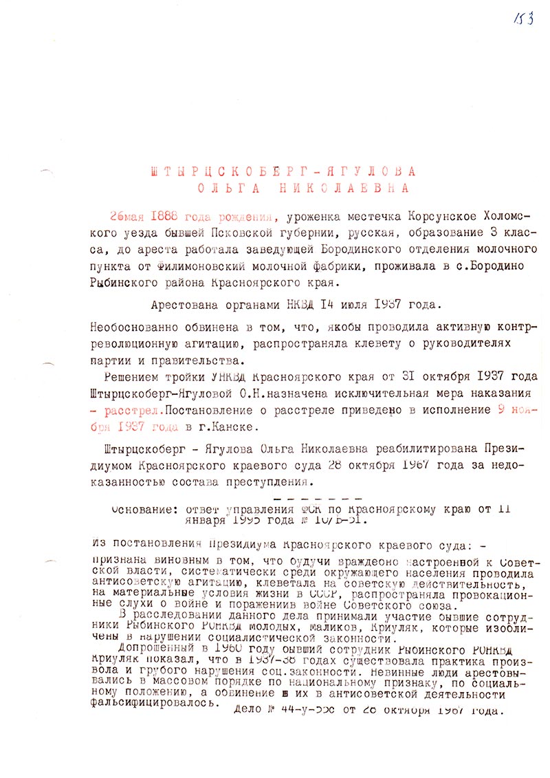 Штырцскоберг-Ягулова Ольга Николаевна реабилитирована Президиумом Красноярского краевого суда 28 октября 1967 года за недоказанностью состава преступления.