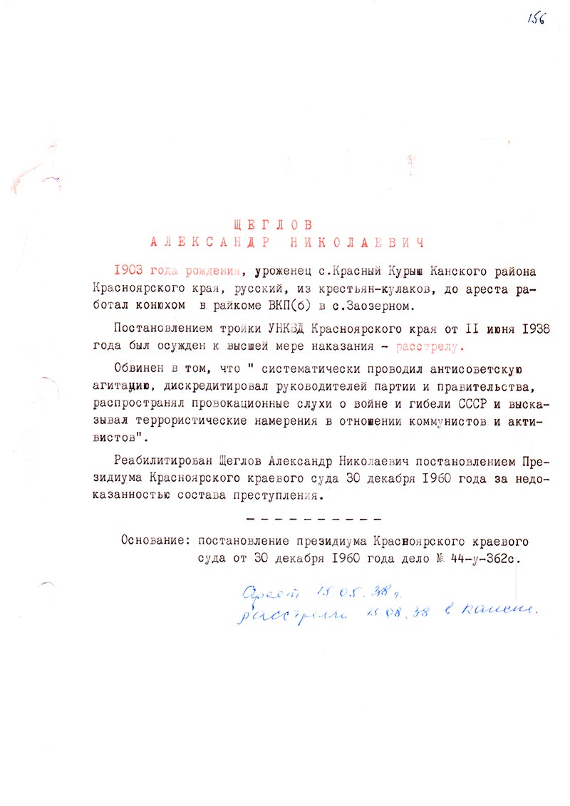 Реабилитирован Щеглов Александр Николаевич постановлением Президиума Красноярского краевого суда 30 декабря 1960 года за недоказанностью состава преступления.