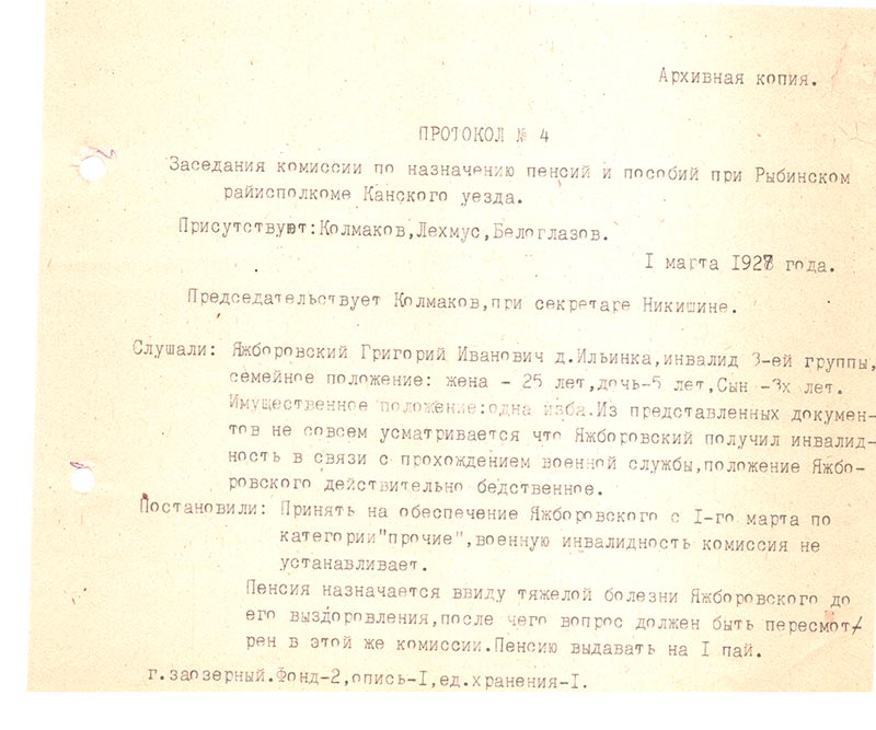 Постановили: Принять на обеспечение Яжборовского с 1-го марта по категории “прочие”, военную инвалидность комиссия не устанавливает.