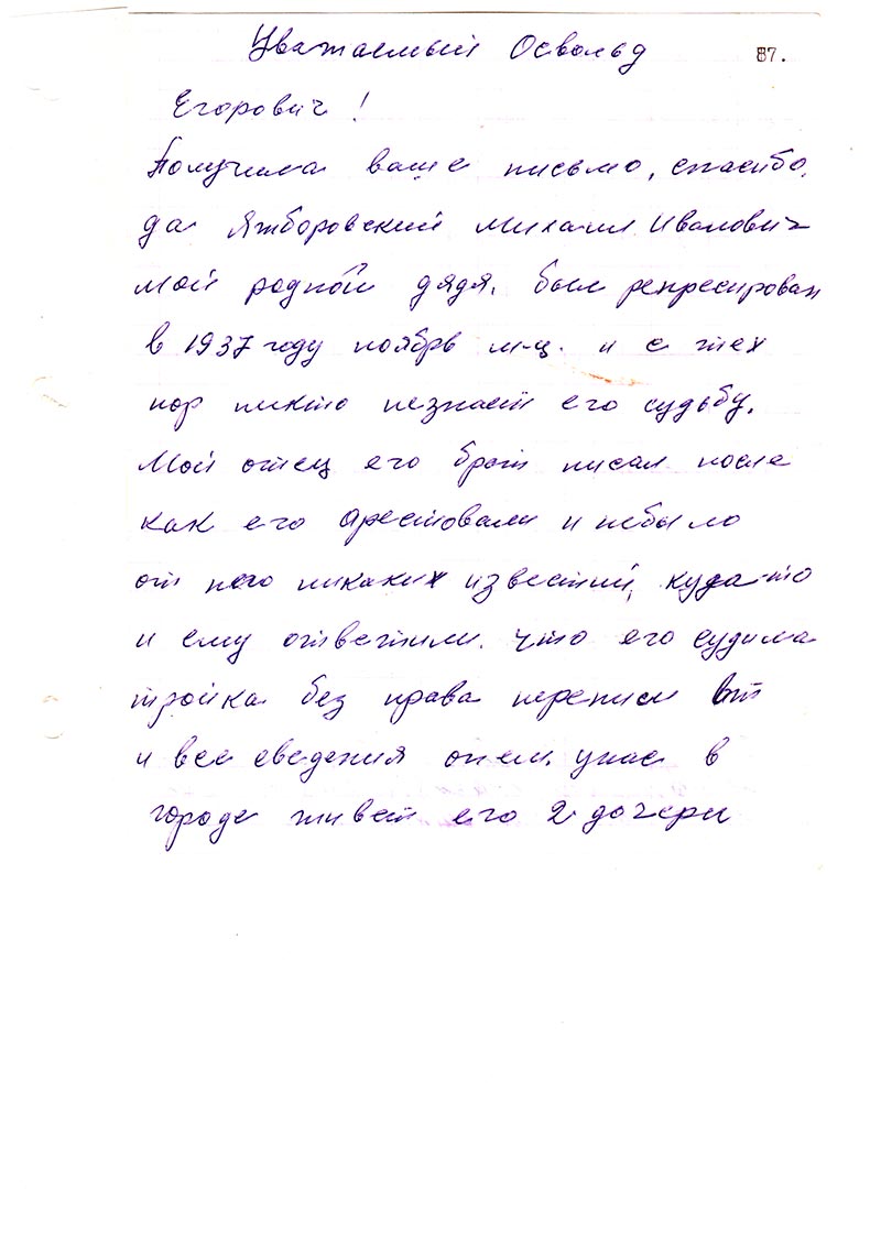 Получила ваше письмо, спасибо. Да, Яжборовский Михаил Иванович мой родной дядя,