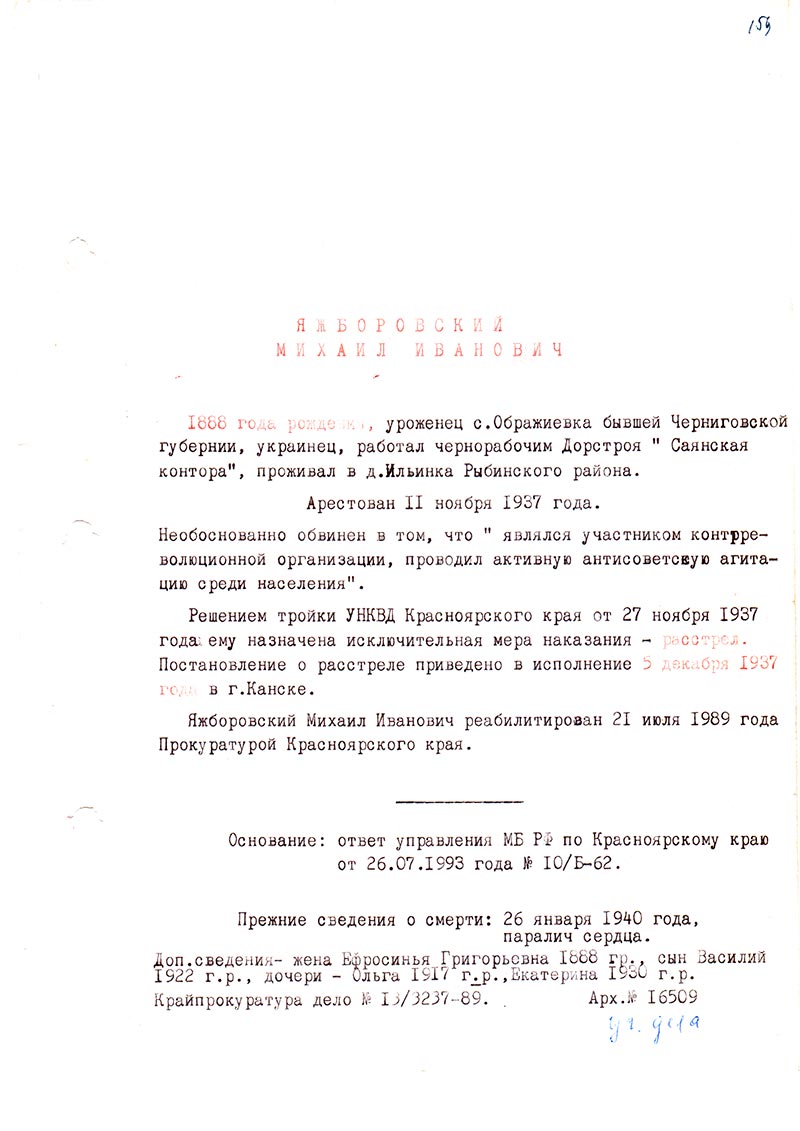 Яжборовский Михаил Иванович реабилитирован 21 июля 1989 года Прокуратурой Красноярского края.